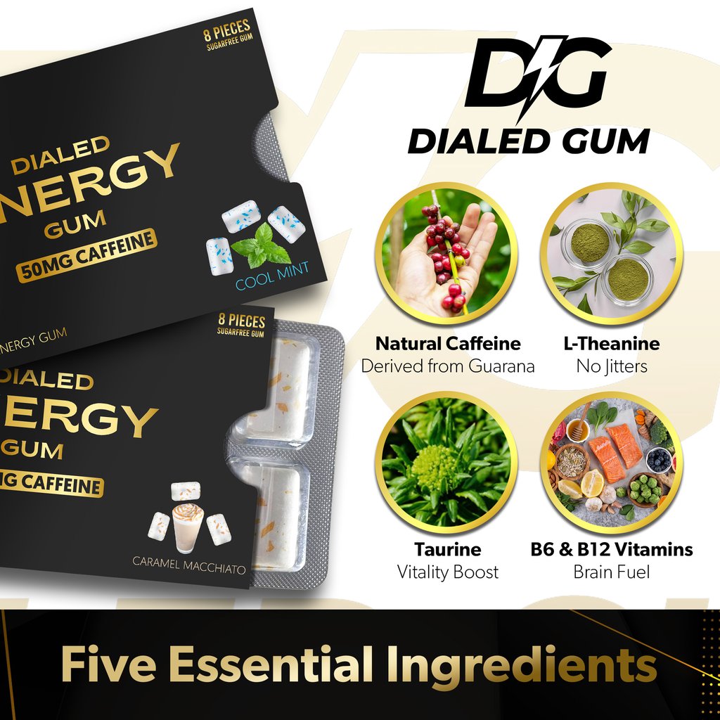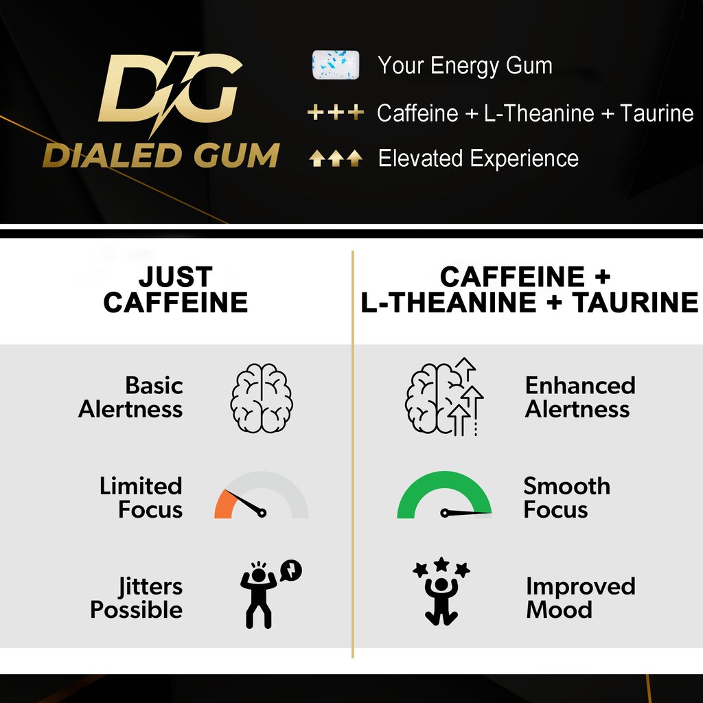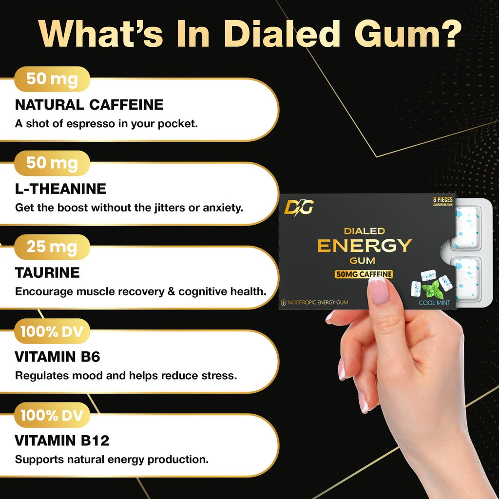 ⚡ FAST ENERGY + NOOTROPICS: 50mg of Caffeine in each piece of Dialed Energy Gum! Not only does our fast-absoprtion healthy gum, but our sugar free gum is packed with L-theanine, Taurine and Vitamins B6+B12 to ensure your energy is jitter and crash free.